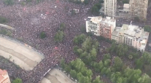 示威者集中在圣地亞哥市中心名為意大利廣場(chǎng)的地標(biāo),現(xiàn)場(chǎng)人頭攢動(dòng),群情激憤。BBC新聞網(wǎng)形容,這是智利于上世紀(jì)九十年代“民主化”以來(lái)最大規(guī)模的一次游行。