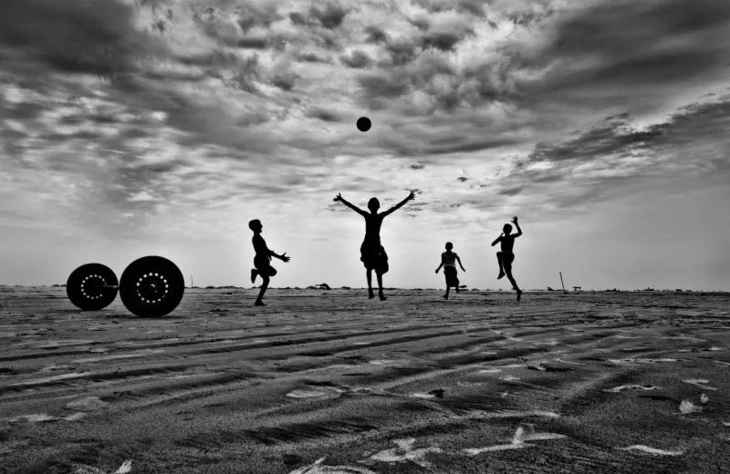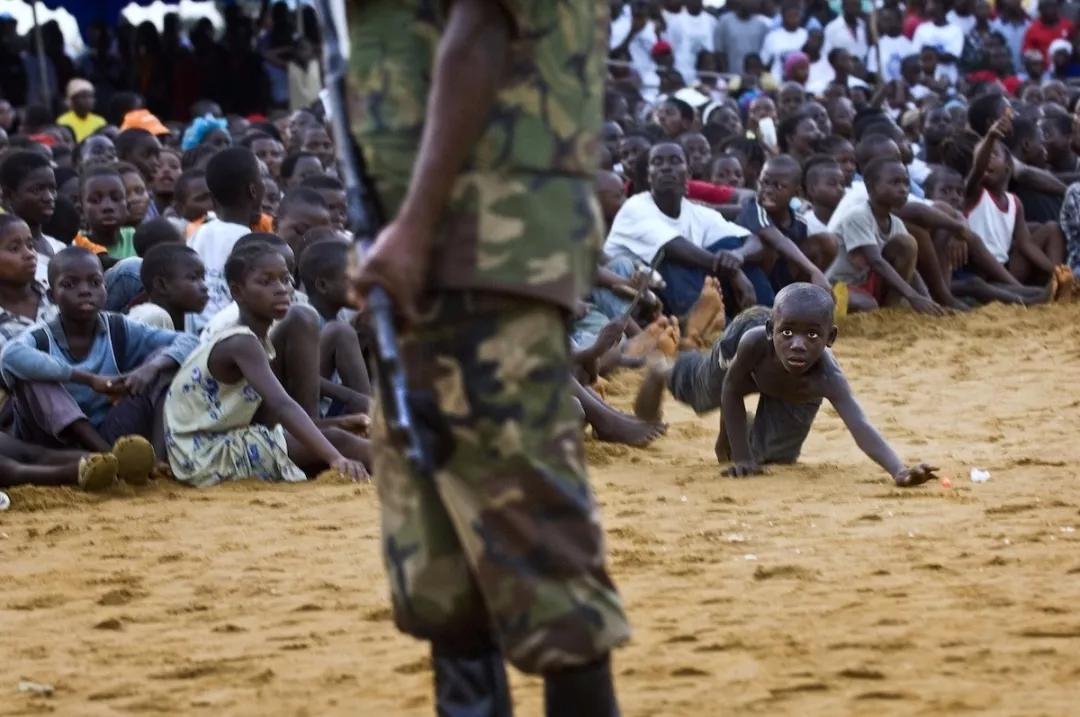 當(dāng)他把鏡頭對準(zhǔn)其中一名士兵的時(shí)候,在圍觀的人群中突然間鉆出來一個(gè)小男孩,試圖撿回他掉出去的球。利比里亞經(jīng)歷了多年的內(nèi)戰(zhàn),這個(gè)小男孩在戰(zhàn)爭中長大,他本能地害怕士兵和他們手中的槍。他想要把自己寶貴的球撿回來,然而他的眼睛卻一直緊緊盯著前面的士兵。