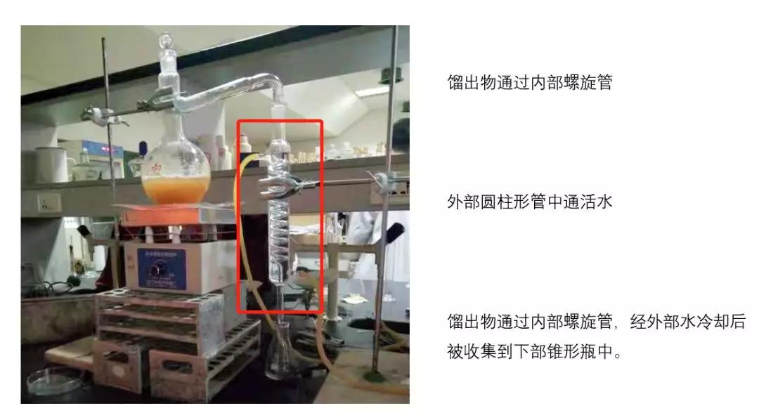 ▲ 筆者讀書(shū)時(shí)在實(shí)驗(yàn)室搭建的簡(jiǎn)單蒸餾裝置,紅色框線(xiàn)框出裝置為冷凝管,大家湊合看。