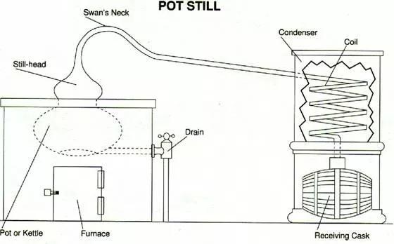 壺式蒸餾器是最古老的蒸餾器,結(jié)構(gòu)也相對(duì)簡(jiǎn)單。由于壺式蒸餾器每次僅能少量提高酒精度,因此在蒸餾時(shí)須采用分批蒸餾法才能保證得到足夠的酒精度。且每次蒸餾前,必須清理蒸餾器后才可重新裝入酒液進(jìn)行下一次蒸餾。