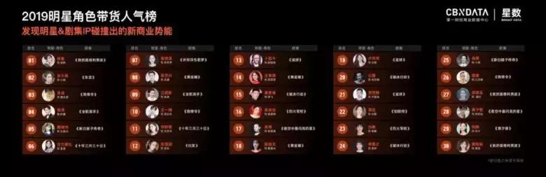 最近首屆互聯(lián)網(wǎng)影視文娛盛典推出的號稱國內(nèi)首份基于真實消費數(shù)據(jù)的角色帶貨力榜單“2019明星角色帶貨人氣榜”。