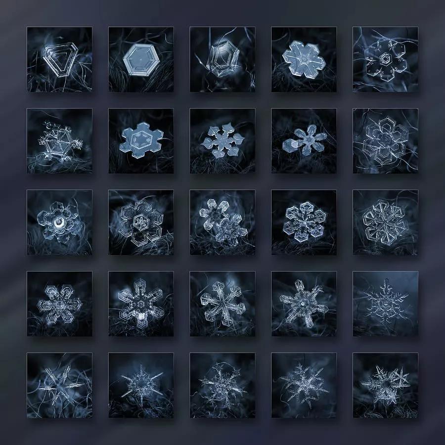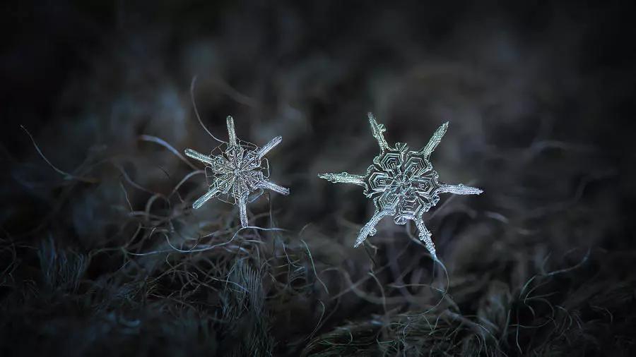 經(jīng)過(guò)多次嘗試后,克拉托夫最后采用了兩種辦法拍攝,一種是讓雪花落在深色的羊毛織物上,混合著渾濁天空下的自然光拍攝;另一種是使用 LED 燈作為輔助工具,逆光拍攝宛若水晶一般的雪花。
