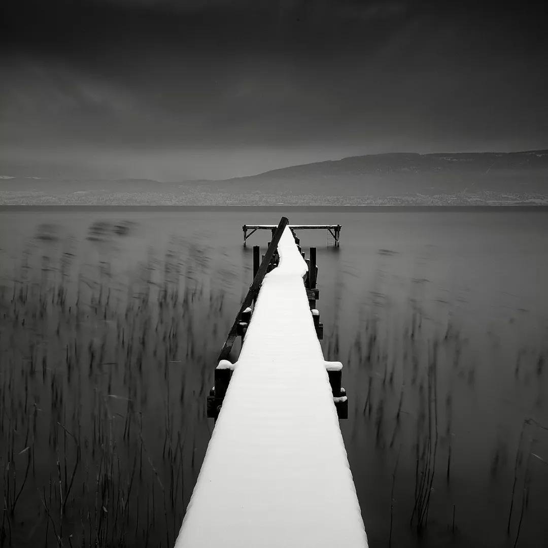 無(wú)論是拍攝點(diǎn)綴著零星樹(shù)叢的遠(yuǎn)景,白雪覆蓋的碼頭,還是陷入混沌狀態(tài)的建筑,佩萊格里尼運(yùn)用的長(zhǎng)曝光拍攝手法都將這一處處風(fēng)景凝練成“固態(tài)”,也給我們的心靈帶來(lái)一種美與靜的享受。