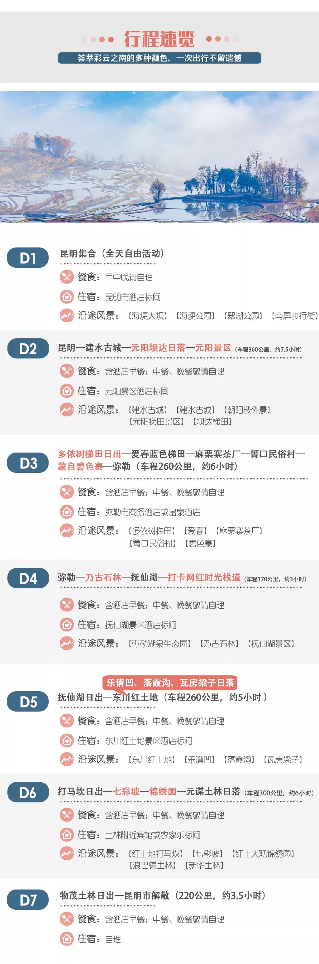 8、請對應使用我方云南7日行程,因使用其它行程造成的投訴,責任自負;請仔細閱讀以上行程文檔,同意并保證遵守我方安排,以免為您帶來不必要的麻煩;如產(chǎn)生合同糾紛或人身意外事故,按《中華人民共和國合同法》、《道路交通法》、《保險賠償條例》裁定;本行程作為旅游合同附頁與旅游合同同等法律效力。