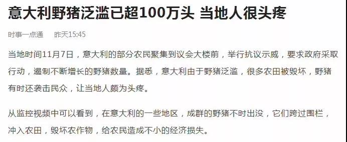 意大利的農(nóng)民聚集到議會門前,要求政府采取措施,遏制已泛濫超百萬頭的野豬群。當(dāng)?shù)匾柏i十分霸道:它們毀壞農(nóng)田,襲擊民眾,連種族的天敵——狼都不敢輕易接近,每年給意大利農(nóng)民造成的直接經(jīng)濟(jì)損失超過1億歐元。