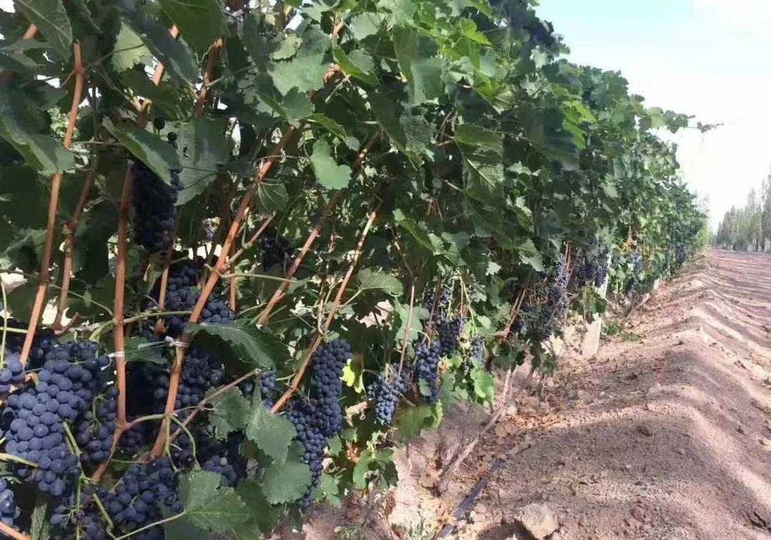 ▲ 新疆天塞的葡萄園,果實(shí)在齊腰高,整齊的一排
