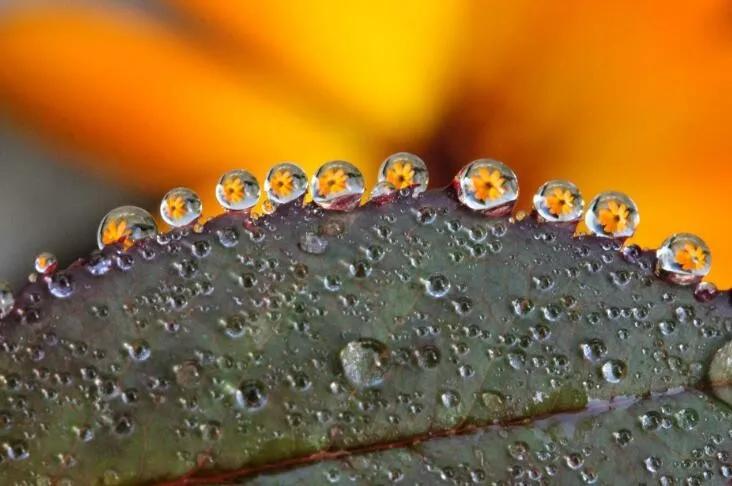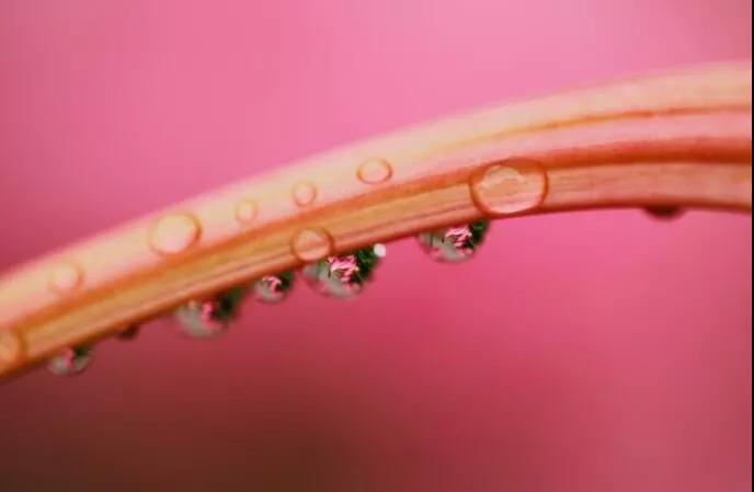 還有一種思路就是如果有針筒,也可以在這種樹葉上去噴,那么這個(gè)水滴呢,盡量噴的大小相同,然后,在背景后面再放一朵花,在水滴里面它就會(huì)有花朵的這種形態(tài),那么這個(gè)微距呢是平時(shí)最多人拍的。