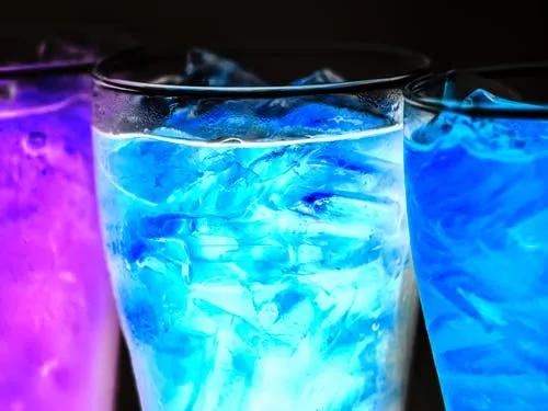 八、活斯布魯:15mL青檸果汁、25mL橙味利口酒、25mL金酒。先用藍(lán)色橙味利口酒沾濕古典杯杯口,將杯口沾滿糖粉,杯內(nèi)放入3塊冰塊,之后將配方中所給材料搖妥后濾入杯中。