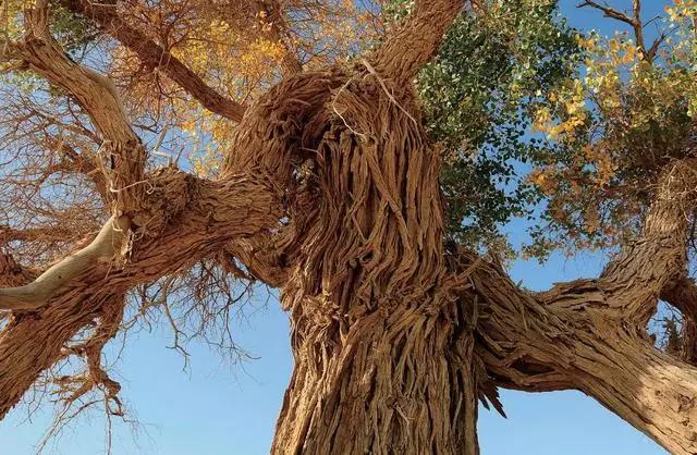 采用仰視角度拍攝樹木的枝干,歲月留下的斑駁痕跡在藍(lán)天背景的襯托之下顯得特 別突出,畫面也因此充滿了百折不撓的力量感和張力