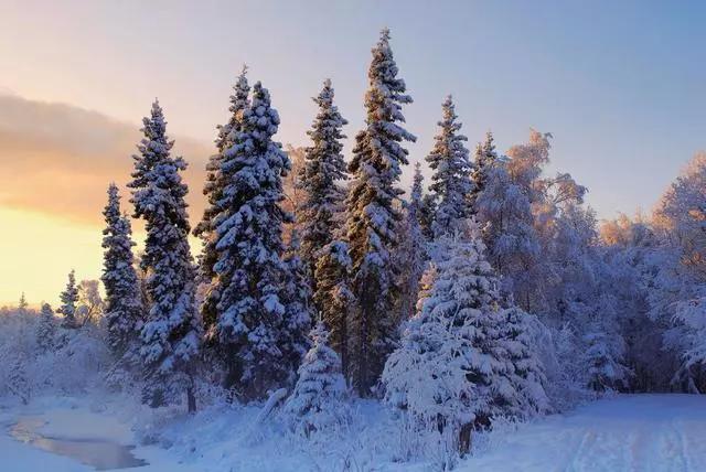 樹木在大雪之下安靜地沉睡著,藍(lán)色的色調(diào)使其更 顯冰冷與安寧。忽然,一抹霞光闖了進(jìn)來,畫面最 終表現(xiàn)出光影豐富、色調(diào)迷人的效果