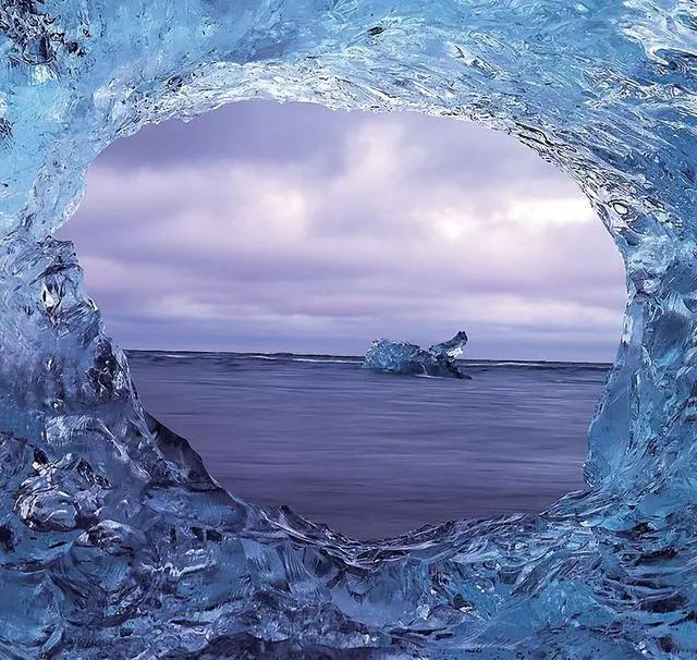透過冰塊上這個畫框式的洞孔看到了局部的水面 和天空,水面上搖動的浮冰在低色溫下呈現(xiàn)出夢 幻般的藍(lán)紫色調(diào),給人亦真亦幻的感覺