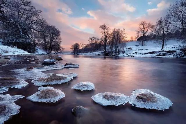 尚未落盡的晚霞照射在水面上,水面上結(jié)冰的石塊由大到 小、由遠(yuǎn)及近地把畫面的空間感較好地表現(xiàn)出來,再加 上采用逆光拍攝,使岸邊的樹木呈現(xiàn)出迷人的剪影效果。攝影師只有具備了精湛的技術(shù)才能拍出這樣精彩的畫面