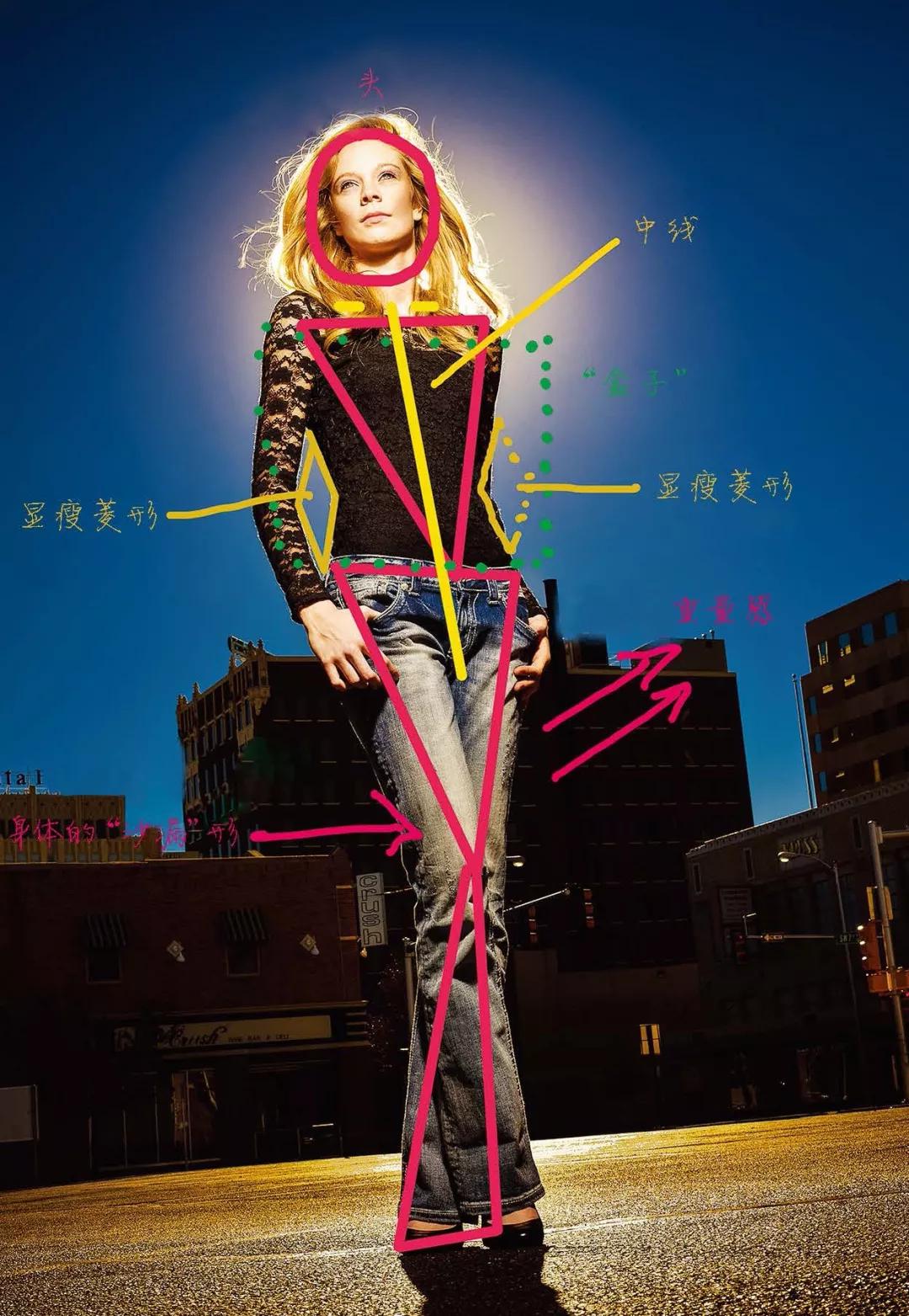 男人以正面的角度面對相機,給人一種高大、寬厚、輪廓清晰的感覺。但對于女人來說,攝影師要做的則是使她們看起來瘦一點,再瘦一點,最好可以瘦 得像一支鉛筆。