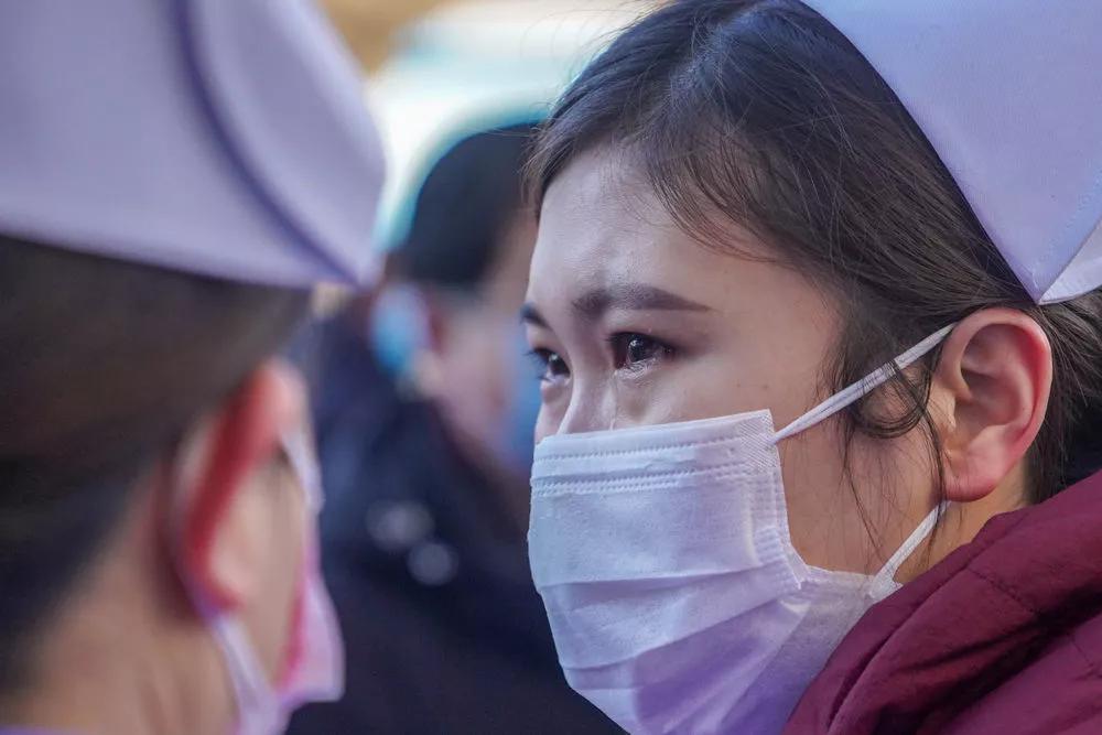 1月26日,在吉林省援助湖北省抗擊新型冠狀病毒感染肺炎醫(yī)療隊出征儀式現(xiàn)場,一名護(hù)士送別醫(yī)療隊同事時落淚。