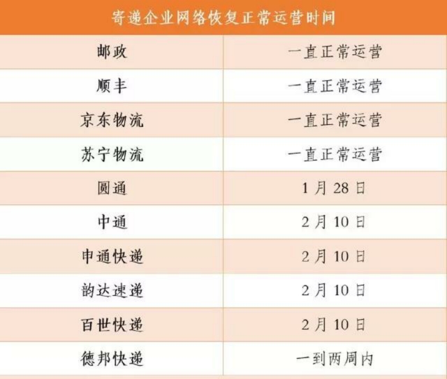 快遞公司全面復(fù)工快遞公司全面復(fù)工,但在春節(jié)和疫情期間,中國(guó)郵政、順豐速運(yùn)、京東物流、蘇寧物流一直處于正常運(yùn)營(yíng)的狀態(tài)。中通快遞、圓通快遞、申通快遞、韻達(dá)速遞以及百世快遞等企業(yè)將從2月10日(今天)陸續(xù)恢復(fù)到正常運(yùn)營(yíng)模式。