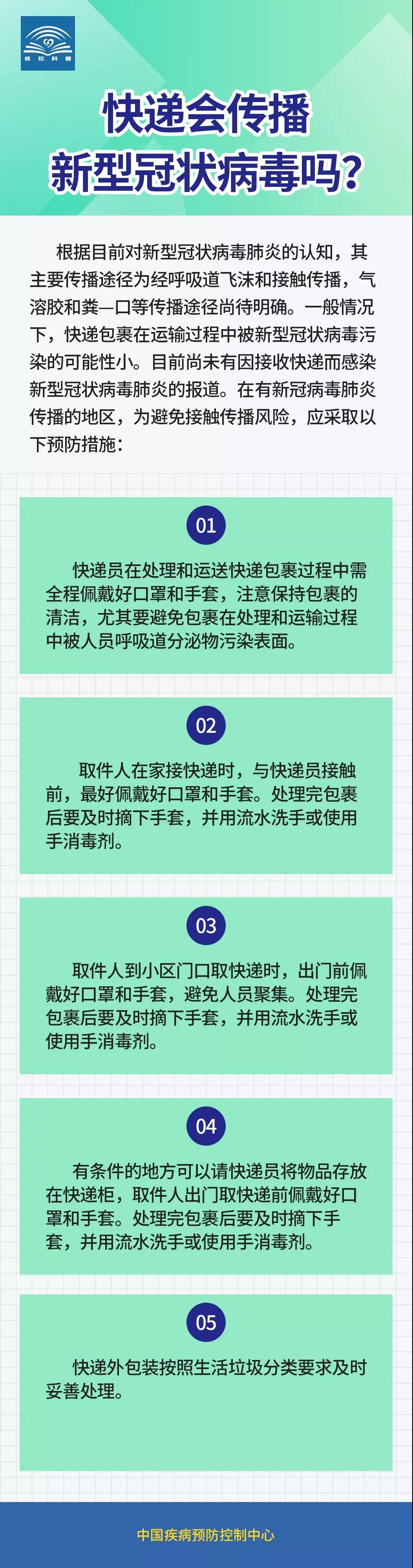 疫情之下,網(wǎng)上購(gòu)物成為很多人獲取生活物資的首選方式,但也引發(fā)了一些擔(dān)憂,快遞會(huì)傳播新型冠狀病毒嗎?我們?cè)撊绾胃玫乇Wo(hù)自己?中國(guó)疾控中心提示,快遞包裹在運(yùn)輸過(guò)程中被新型冠狀病毒污染的可能性小,目前尚未有因接收快遞而感染新冠肺炎的報(bào)道。