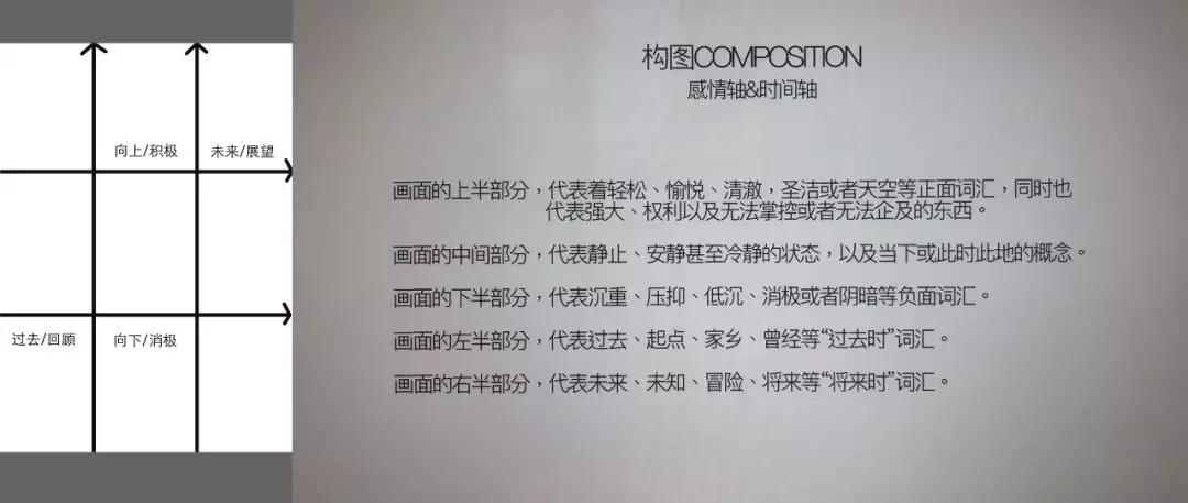 1.畫面中下-中-上/左-中-右的方向軸(以及由此構(gòu)成的不同區(qū)域空間),既是視覺觀看(基本)的時間順序軸,也是視覺心理的情緒變化軸。