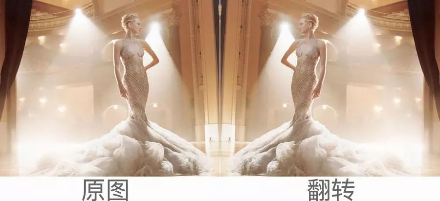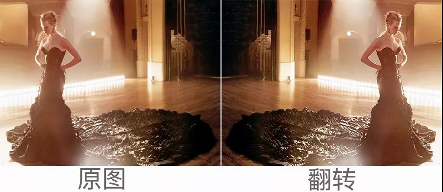 人物面部朝左,視覺情感傾向是憂郁內(nèi)斂的,配合低頭的姿態(tài),仿佛有一種回顧往昔、自我勉勵、積蓄力量以面對未來挑戰(zhàn)的感受。無論是禮服的色彩還是遠(yuǎn)景處的黑色部分都非常貼合這種情感聯(lián)想。反之,翻轉(zhuǎn)后則被削弱了。并且由于右邊空間的壓縮,使人物產(chǎn)生一種畏縮、抗拒未來的感覺。