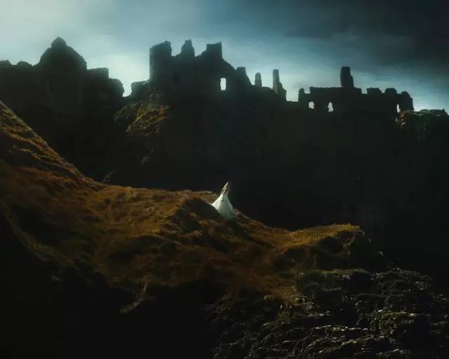 婚紗照數(shù)量龐大,要想拍出絕對的新意很難了,但在美感上,留給攝影師的空間還是很多的。像下圖這張作品,一方面利用了富有詩意的側(cè)光來刻畫人物,表現(xiàn)山坡上植被的唯美色調(diào);另一方面則突出表現(xiàn)了古堡的剪影,勾勒出偵探電影般的幽深氛圍。