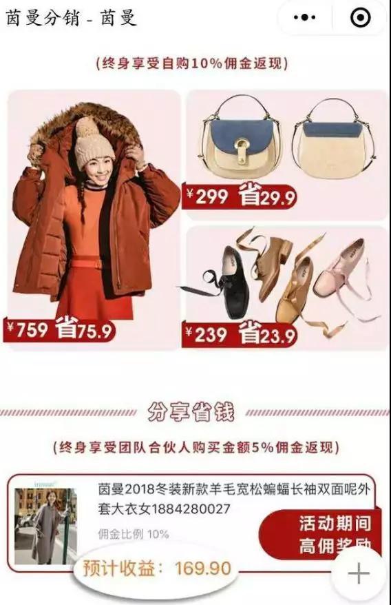從淘寶電商起家的茵曼反應更為迅速,疫情爆發(fā)后聯(lián)動了600多家門店開展社群營銷,利用小程序、朋友圈、微信群等方式,引導顧客消費。此外,茵曼對外招募了1萬名“茵曼推手”。只需在茵曼小程序掃碼下單滿100元,便可成為“茵曼推手”,有效期為180天,“推手”們可享受最高達實付金額20%的推廣傭金。