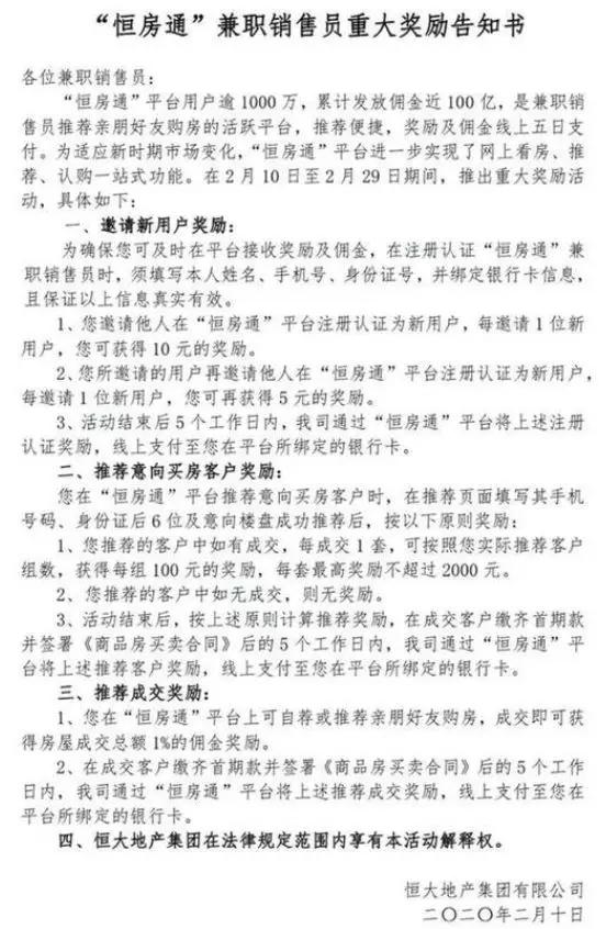 恒大“75折優(yōu)惠”線上營銷,讓疫情之下房企的線上賣房模式受到關注。2月10日,恒房通上線分銷激勵,針對自購、推薦他人購買、第三方購買、推薦新客戶等不同情況,推出了不同傭金及獎勵,比如說推薦別人購買的,不僅定金全額返還,并可獲1%傭金及1萬元獎勵。
