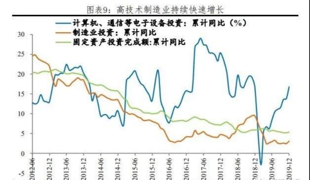 但高技術(shù)制造業(yè)投資快速增長(zhǎng),產(chǎn)業(yè)結(jié)構(gòu)持續(xù)優(yōu)化,短板領(lǐng)域投資加強(qiáng)。2019年高技術(shù)制造業(yè)同比17.7%,較2018年提高1.6個(gè)百分點(diǎn),占制造業(yè)投資比重超過(guò)20%。道路運(yùn)輸業(yè)、生態(tài)保護(hù)和環(huán)境治理業(yè)以及信息服務(wù)業(yè)投資等短板領(lǐng)域投資得到加強(qiáng),投資同比分別為9.0%、37.2%和17.4%。