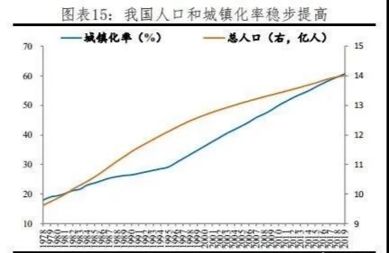 2019年城鎮(zhèn)化率達(dá)60.60%,比上年末提高1.02個(gè)百分點(diǎn),保持穩(wěn)步增長(zhǎng)態(tài)勢(shì),較高收入經(jīng)濟(jì)體的81.3%仍有20個(gè)百分點(diǎn)的空間。過(guò)去四十年,中國(guó)城鎮(zhèn)常住人口從1.7億快速增至8.5億,凈增加6.8億,城鎮(zhèn)化率從17.9%提升至60.6%,提高43個(gè)百分點(diǎn),深刻地改變了中國(guó)經(jīng)濟(jì)社會(huì)格局,成就了過(guò)去中國(guó)重化工業(yè)、大規(guī)?;A(chǔ)設(shè)施投資、房地產(chǎn)、消費(fèi)升級(jí)等的飛速發(fā)展。