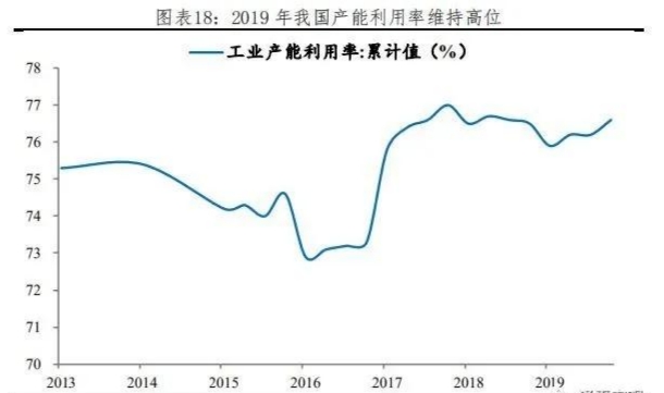 “三去一降一補(bǔ)”成果穩(wěn)固。去產(chǎn)能方面,2019年全國(guó)工業(yè)產(chǎn)能利用率為76.6%,較上年提高0.1個(gè)百分點(diǎn)。其中,黑色金屬冶煉壓延加工業(yè)及煤炭開(kāi)采洗選業(yè)產(chǎn)能利用率分別為80%和70.6%,分別比2018年提高2和0個(gè)百分點(diǎn),均為近幾年來(lái)最高水平。去庫(kù)存方面,2019年末商品房待售面積49821萬(wàn)平方米,較去年減少2593萬(wàn)平方米,相當(dāng)于2013年末的水平。