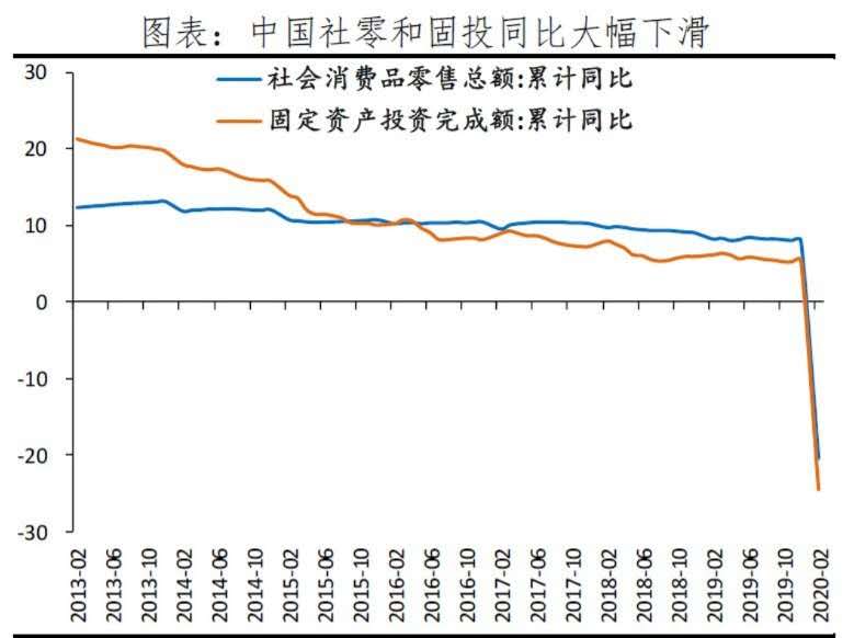 以中國為例,2020年1-2月,中國社會消費品零售總額和固定資產(chǎn)投資完成額累計同比分別從2019年12月的8.0%和5.4%下滑至-20.5%和-24.5%,工業(yè)增加值累計同比從5.7%下滑至-13.5%,2月制造業(yè)PMI從1月的50.0下滑至35.7,均創(chuàng)數(shù)據(jù)公布以來的最低值,遠超2003年SARS和2008年國際金融危機。一季度GDP大概率負增長。