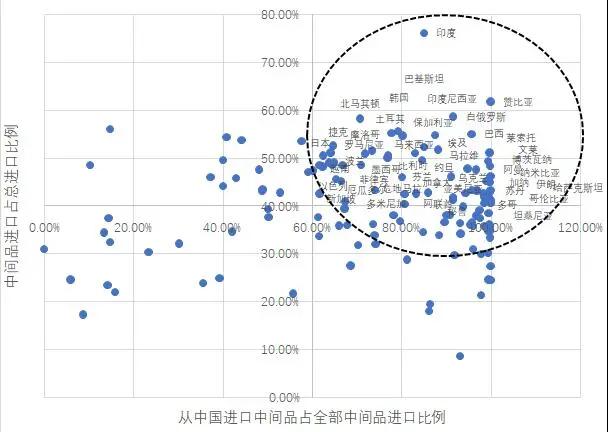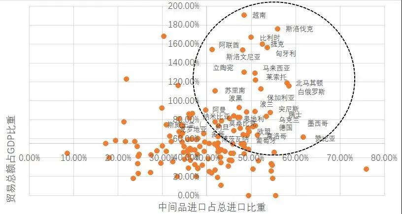 我們計(jì)算了世界各國中間品進(jìn)口額占總進(jìn)口額的比重、從中國進(jìn)口的中間品占其全部中間品進(jìn)口的比重以及各國貿(mào)易總額占GDP的比重。如果一國的前兩個(gè)指標(biāo)比較高,則說明該國對中國的中間品進(jìn)口有較高的依賴度。在此基礎(chǔ)上,若該國同時(shí)擁有較高的對外貿(mào)易依存度,則說明該國的整體經(jīng)濟(jì)對中國進(jìn)口的依賴程度更高,進(jìn)而表明該國在此次新冠疫情中會(huì)受到較大沖擊。