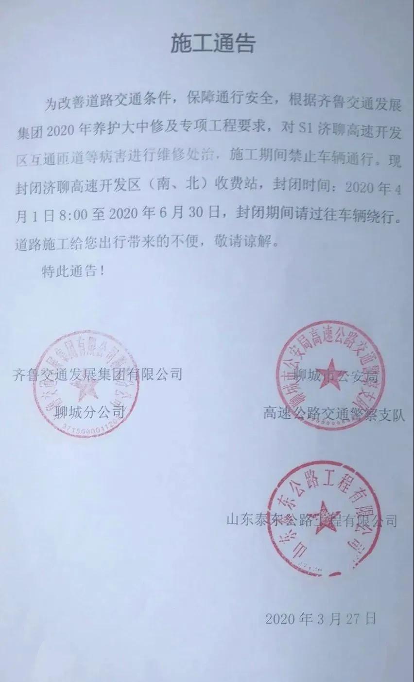 因濟(jì)聊高速開發(fā)區(qū)互通立交施工需要,2020年4月1日8:00至2020年6月30日,封閉濟(jì)聊高速聊城開發(fā)區(qū)收費(fèi)站(南北崗),封閉期間請過往車輛繞行,道路施工給您出行帶來的不便,敬請諒解。