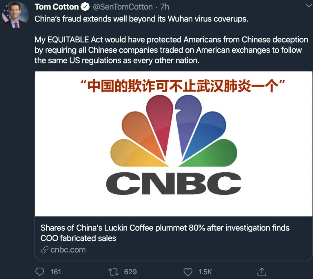 但是美國一個反華參議員囂張地轉(zhuǎn)載了瑞幸事件的新聞,配文說“中國的欺詐行為遠(yuǎn)不止武漢肺炎”。