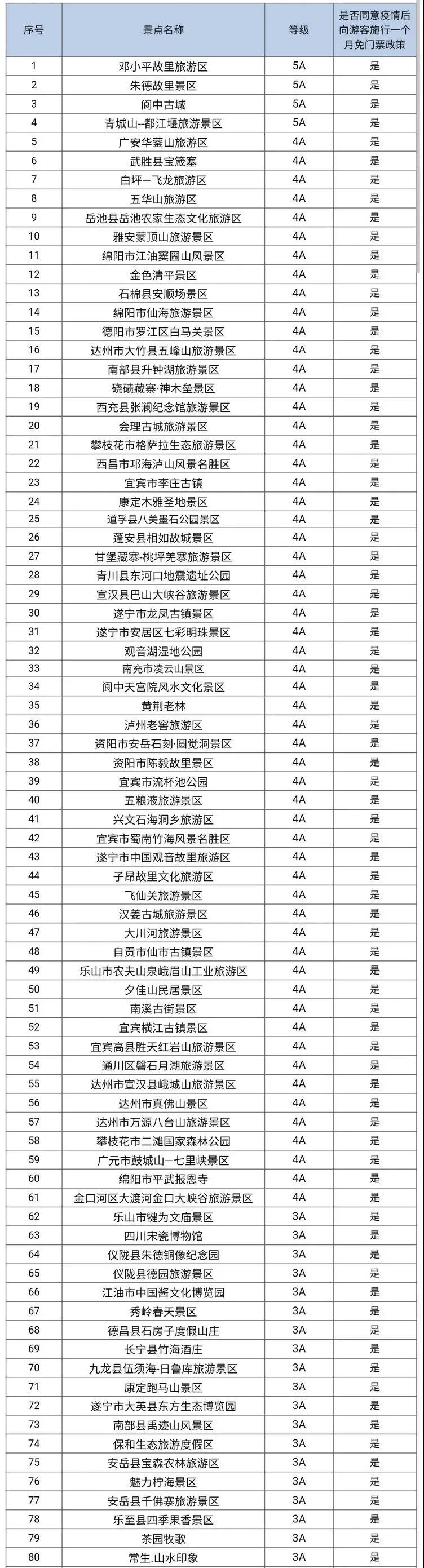 4月1日,四川省旅游景區(qū)協會公布,全省112個景區(qū)在4月對所有游客免門票!實行免費景區(qū)名單如下: