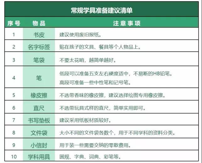 開(kāi)學(xué)前,家長(zhǎng)可以幫助低段的孩子共同討論一個(gè)學(xué)具準(zhǔn)備清單,高段的孩子可以自主準(zhǔn)備。給家長(zhǎng)們提供了一份清單,僅供參考。
