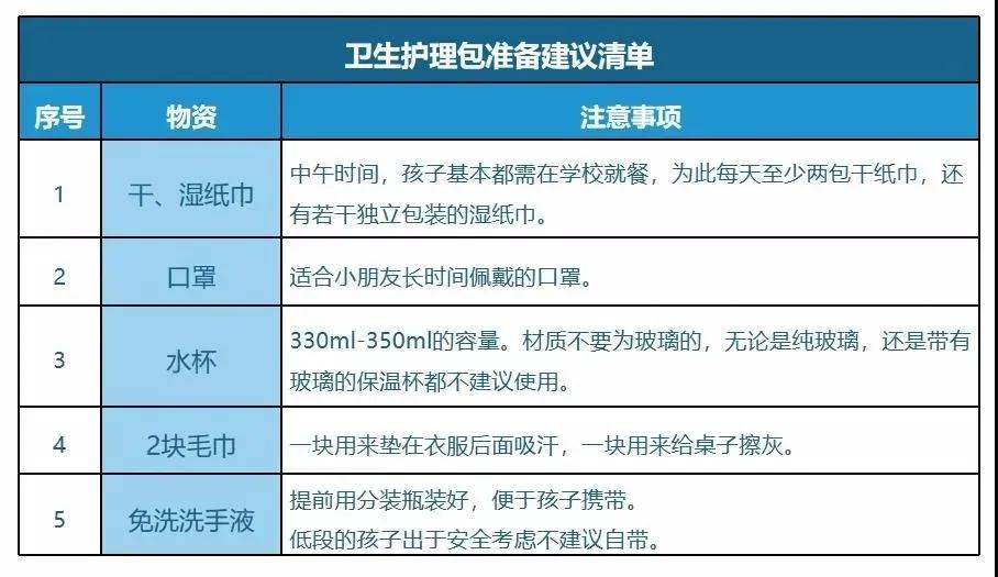 除了學(xué)具的準(zhǔn)備外,家長(zhǎng)可以跟孩子做好疫情期間的抗疫物品準(zhǔn)備。比如,可以準(zhǔn)備個(gè)衛(wèi)生護(hù)理包,護(hù)理包里準(zhǔn)備兩個(gè)口罩,一些濕紙巾,兩包干紙巾,條件允許的話(huà)還可以準(zhǔn)備免洗的洗手液或者消毒液,或者一次性的小方巾。