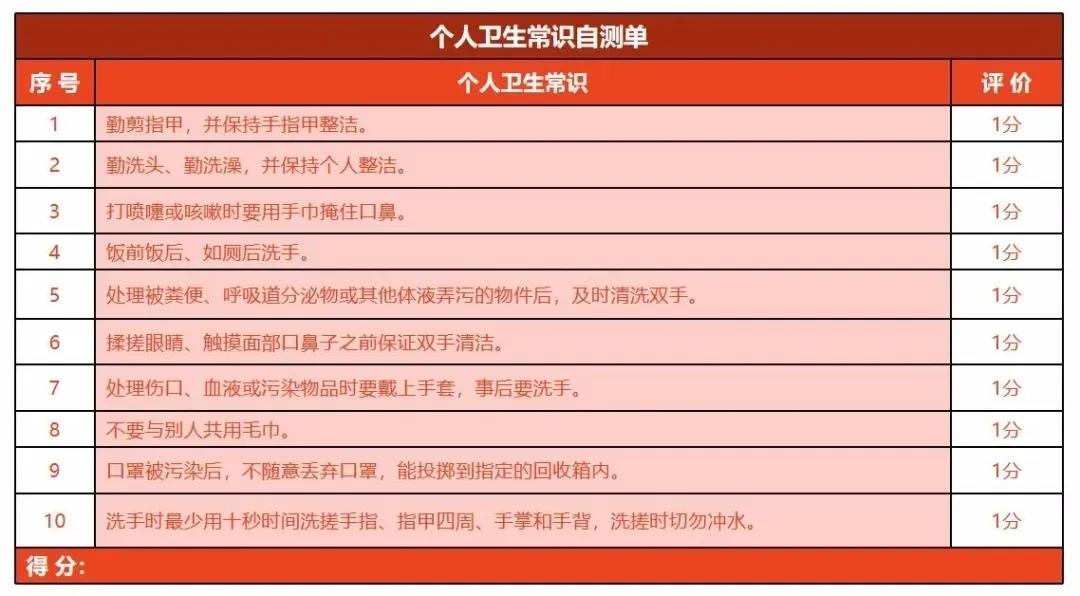 在家里提前與孩子學(xué)習(xí)個(gè)人衛(wèi)生的相關(guān)知識(shí),增強(qiáng)自我保護(hù)意識(shí)。這里,也給大家總結(jié)了一些自我保護(hù)的自測(cè)單,可以做到的話(huà)+1分。