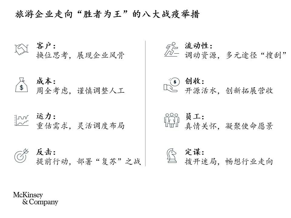 麥肯錫結(jié)合自身在旅游行業(yè)的豐富咨詢經(jīng)驗(yàn),以及過去幾周的重點(diǎn)調(diào)查研究,總結(jié)出針對(duì)旅游企業(yè)的八大戰(zhàn)“疫”舉措。這些舉措詳細(xì)闡明了克服短期現(xiàn)金流危機(jī)的方法,以及企業(yè)應(yīng)在恢復(fù)期中如何謀篇布局,希望能為廣大旅游企業(yè)提供一些參考,并與全行業(yè)共勉。