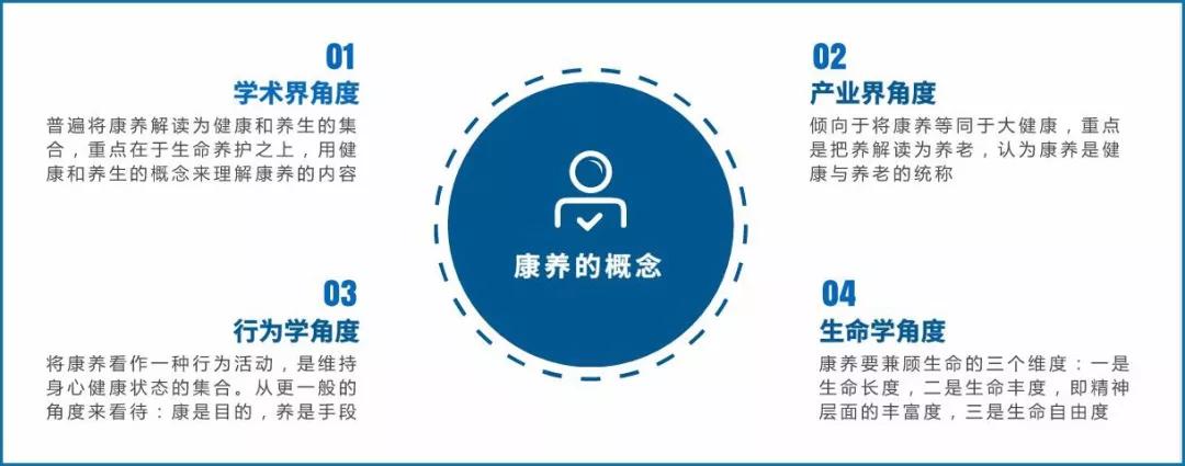 產(chǎn)業(yè)界角度:傾向于將康養(yǎng)等同于“大健康”,重點將“養(yǎng)”理解成“養(yǎng)老”。認(rèn)為“康養(yǎng)”是“健康”與“養(yǎng)老”的統(tǒng)稱。