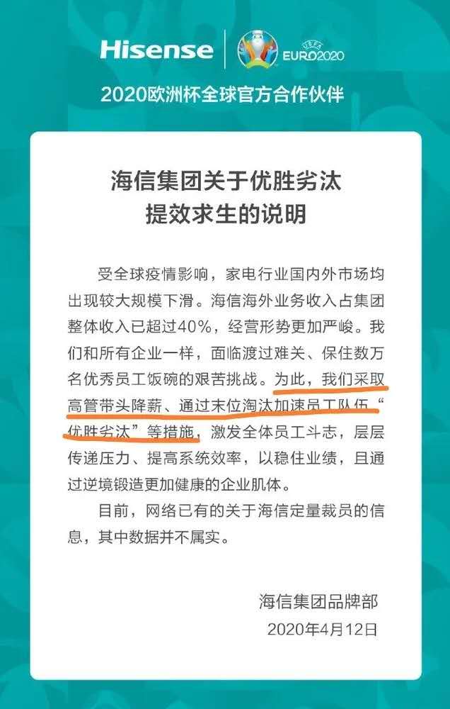 海信集團(tuán)采取高管帶頭降薪、通過(guò)末位淘汰加速員工隊(duì)伍“優(yōu)勝劣汰”等措施,激發(fā)全體員工斗志,層層傳遞壓力、提高系統(tǒng)效率,以穩(wěn)住業(yè)績(jī),且通過(guò)逆境鍛造更加健康的企業(yè)肌體?!?br />