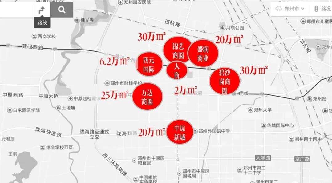 鄭州市中原區(qū)單單幾個(gè)大型商業(yè)中心的體量之和已經(jīng)突破130萬㎡。再加上約50萬㎡的社區(qū)底商,保守估計(jì)一下——