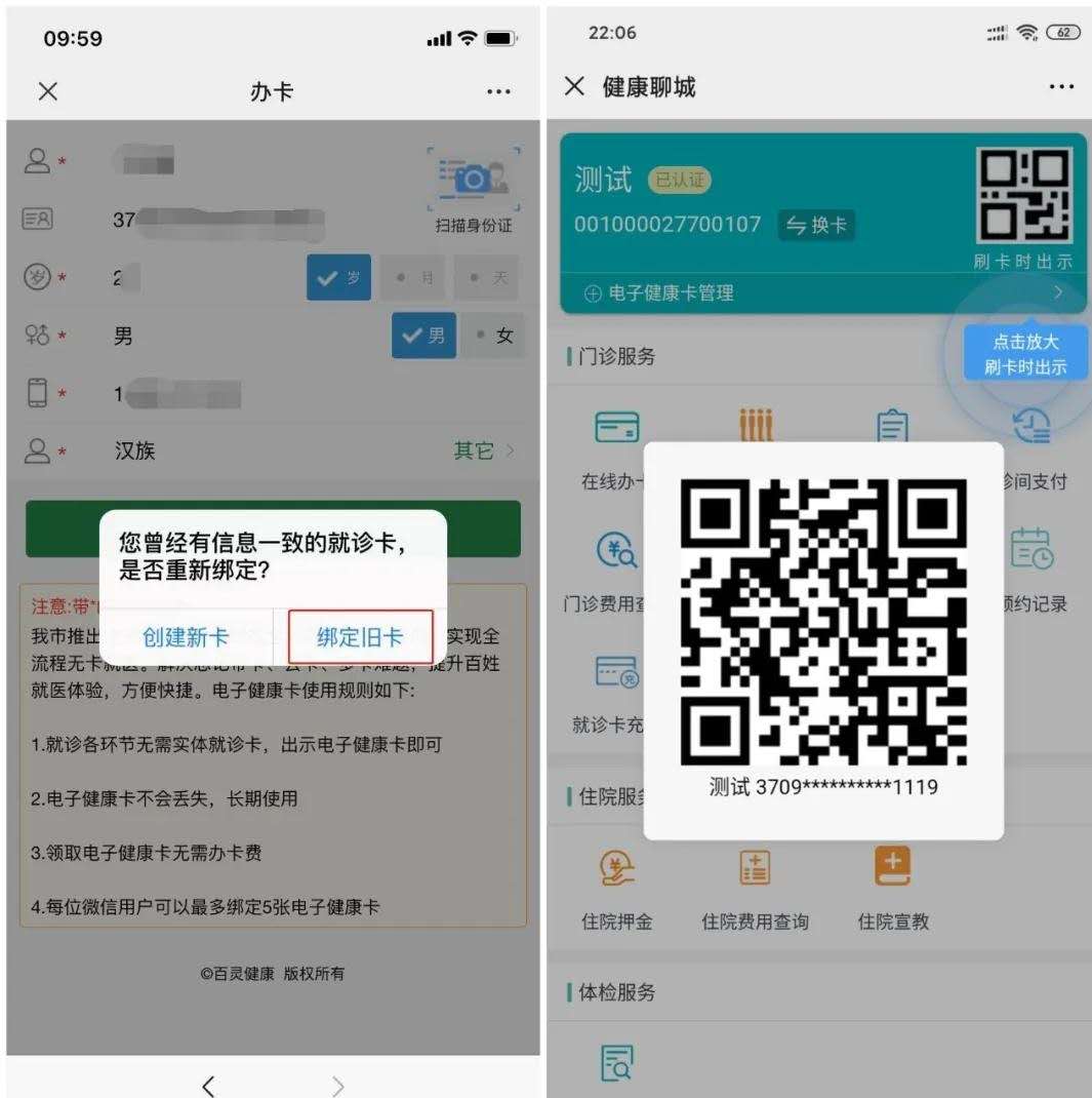 點擊完成后可能會提示您之前已經(jīng)有過一張電子健康卡,點擊“綁定舊卡”后,就會進入醫(yī)療健康界面了,根據(jù)功能需要點擊功能按鈕,或者就診時出示電子健康卡就可以了: