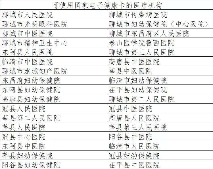 目前聊城市可以正常使用國家電子健康卡的醫(yī)療機構(gòu)如下表: