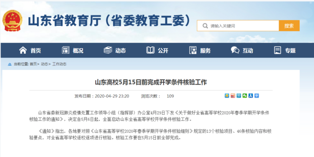 據(jù)山東省教育廳4月29日消息,山東省委新冠肺炎疫情處置工作領(lǐng)導(dǎo)小組(指揮部)辦公室4月29日下發(fā)《關(guān)于做好全省高等學(xué)校2020年春季學(xué)期開學(xué)條件核驗(yàn)工作的通知》,決定自5月6日起,全面啟動(dòng)山東全省高等學(xué)校開學(xué)條件核驗(yàn)工作。