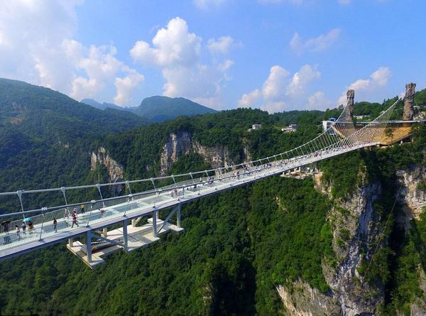 位于張家界大峽谷景區(qū),是世界最高、跨度最長的玻璃橋,大橋建在大峽谷兩側的峰頂上,橫跨大峽谷。橋拱距谷底相對高度約400米,全長約370米,橋面全部采用透明玻璃鋪設,橋中心有全球最高的蹦極。18年,在國際橋梁大會上斬獲阿瑟·海登獎,成為湖南第一個獲得國際最高獎項的橋梁工程項目。