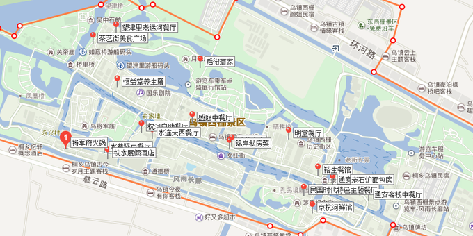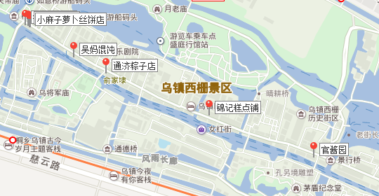 由于西柵在面積上比東柵大很多,所以西柵會(huì)有更多空間來容納更多美食。僅烏鎮(zhèn)官方推薦的餐館就有圖上標(biāo)注的這些。