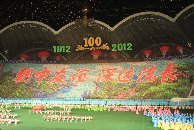 背景變換由朝鮮的小學(xué)生們手舉彩色翻板組成