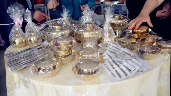 雖然朝鮮整體的生活水平不高,但在專對外國人開放的小賣部或者紀念品店,商品的價格并不低。朝鮮特色的純銅筷子(一雙)+勺子(一個),每套根據(jù)份量不同,有20元和25元人民幣兩種價格,一套銅碗260元人民幣,40度的高麗人參酒100元人民幣/瓶,一瓶朝鮮特色辣醬20元人民幣,一件紀念T恤100元人民幣。
