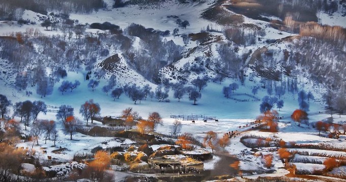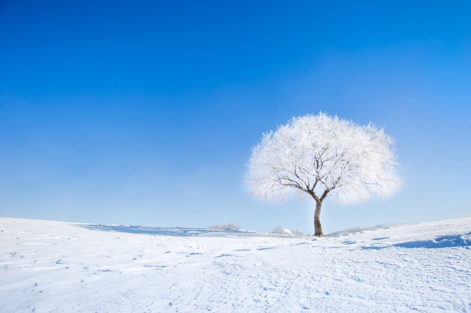 冬季的烏蘭布統(tǒng)儼然是一個白雪皚皚,銀裝素裹的冰雪童話世界,越野車進入塞罕壩森林公園時,道路兩邊都是鱗次櫛比的筆直的參天大樹(估計是松柏類),白茫茫的一片,甚至有幸一睹雪白的狐貍,或許是太冷了外出覓食,但是并沒有停留很久就不見了蹤跡,讓人懷疑是否出現(xiàn)過。這里沒有雪鄉(xiāng)著名的冰雪蘑菇屋,但這里有小河頭的雪饅頭;這里沒有哈爾濱五彩繽紛的冰雕王國,但這里有小巧精致的冰燈。這里的霧凇甚至比我12年在霧凇島看到的都要壯觀,唯美。