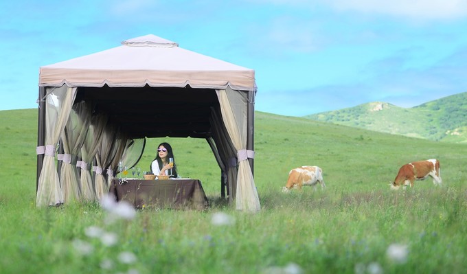 閉上眼睛,思緒飄向遙遠的內(nèi)蒙壩上草原,在蒼茫的草原之上,精致的帷幔,浪漫的輕紗,香檳美酒,可口果盤,美味餐包,手抓羊肉……觥籌交錯間的歡聲笑語一直縈繞在我心頭,回來之后依然會想起那個詩畫般的夢境,久久不能忘懷。去壩上草原之前,我從來沒有想過可以在大草原感受一次高逼格冷餐會,不再是水泥堆砌的四方格子,不再是吵吵嚷嚷的餐廳,一同舉杯,敬藍天白云,敬蒼茫草原,敬身邊這些可愛的人兒。