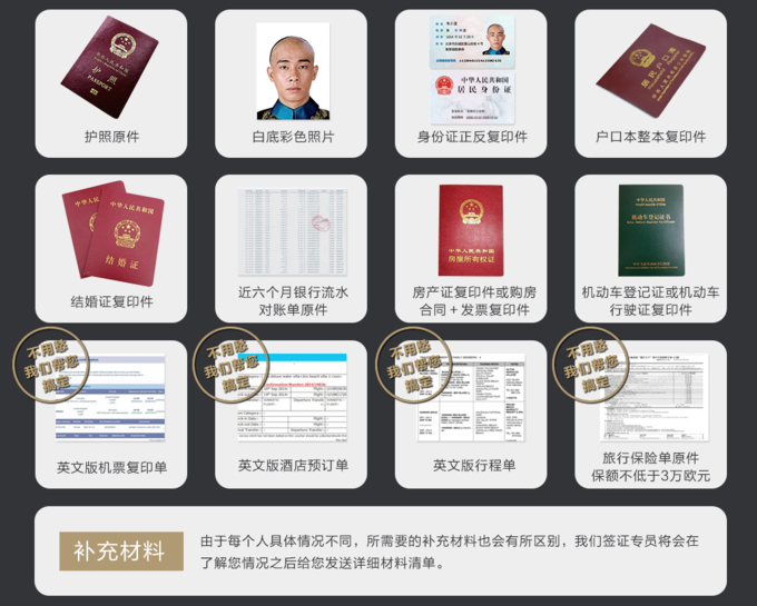 中國(guó)大陸因私護(hù)照(必要)、2寸白底照片(必要)、 保險(xiǎn)(必要)、出行證明 (必要) 、在職證明 /退休證/在讀證明(必要)、 銀行流水 (必要) 、營(yíng)業(yè)執(zhí)照(必要)、身份證復(fù)印件 (必要) 、戶(hù)口本復(fù)印件(每一頁(yè))(必要) 、結(jié)婚證 (可選) 、 車(chē)產(chǎn)(可選)、房產(chǎn) (可選) 等等。 根據(jù)領(lǐng)區(qū)不同可能會(huì)有微妙區(qū)別。